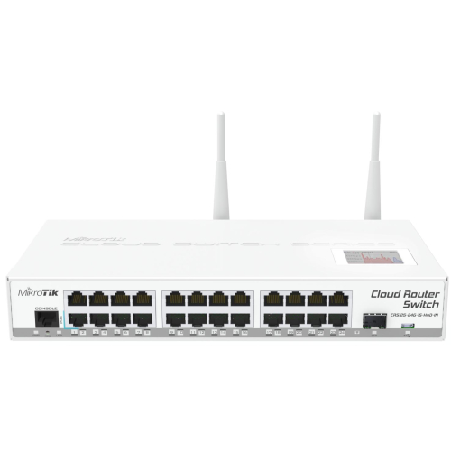 Cloud Router Switch is our new Smart Switch series. It combines the best features of a fully functional router and a Layer 3 switch, is powered by the familiar RouterOS. All the specific Switch configuration options are available in a special Switch menu, but if you want, ports can be removed from the switch configuration, and used for routing purposes. What’s more - this device has a built in 2.4GHz wireless access point, this means you can have an AP, a router with any number of ports, and a full wire speed smart switch, all in one device - ideal for medium/small businesses and offices. It has 24 Gigabit ports, one SFP cage, a microUSB port and a built in Wireless AP. Perfect SOHO gateway router, switch, 11n AP all in one box • Ethernet, Fiber, or 4G (with optional USB modem) gateway connection to Internet • RouterOS gateway/firewall/VPN router with passive cooling • up to twenty-five gigabit switch ports (1xSFP and 24xRJ45) • high power 2.4GHz 11n wireless AP
